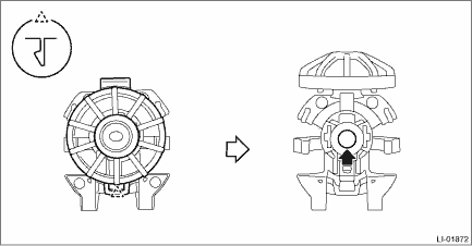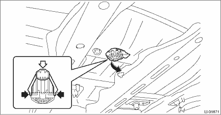 1. Disconnect the ground terminal from battery sensor. NOTE2. Lift up the vehicle, and then remove the rear wheels.3. Remove the nut - axle.CAUTION:Do not loosen the nut - axle while the rear axle is loaded. Doing so may damage the hub unit COMPL.(1) Lift the crimped section of the nut - axle.(2) R ...