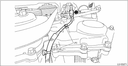 1. Disconnect the ground terminal from battery sensor. NOTE 2. Remove the under cover. Front Under Cover > REMOVAL 3. Drain the engine oil. Engine Oil > REPLACEMENT 4. Disconnect the oil level switch connector from the engine harness, and remove the clip (A) securing the harness.
