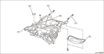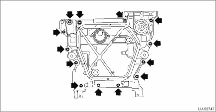 9. Remove the baffle plate from the oil pan upper. 10. Remove stud bolts from the oil pan upper. 11. Remove the O-ring from the cylinder block. 12. Remove the clutch housing cover from the oil pan upper. (MT model)