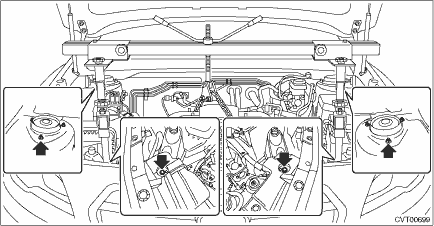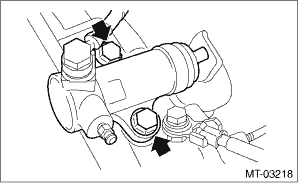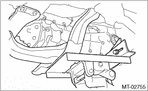 24. Lower the vehicle. 25. Remove the nuts connecting the engine mounting and the transmission main mounting bracket.