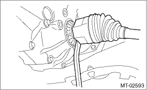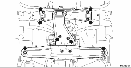 18. Remove the universal joint of the steering shaft. Universal Joint > REMOVAL 19. Remove the propeller shaft. Propeller Shaft > REMOVAL 20. Remove the MT gear shift cable and MT gear select cable from MT gear shift lever. MT Gear Shift Lever > REMOVAL CAUTION: • Do not bend MT gear shift cable and MT gear select cable at a sharp angle. • Disconnect the MT gear shift cable and MT gear select cable at the MT gear shift lever side. • Always use new MT gear select cable if the cable is removed from selector lever COMPL of transmission side. 21. Disconnect the stabilizer link.