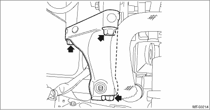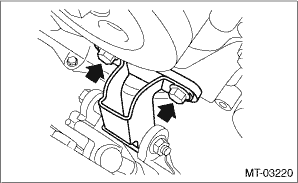 36. Remove the transmission main mounting bracket. NOTE: First, remove the transmission main mounting bracket on the right side of vehicle, and then tilt the engine unit to remove the left transmission main mounting bracket.