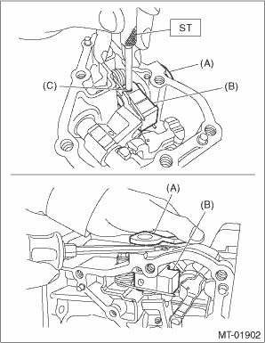 7. Use the ST to remove the straight pin, and remove the selector lever COMPL.