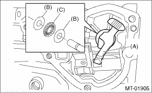 10. Remove the shifter arm No. 2, adjusting washers and thrust bearing.