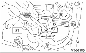 16. Flip over the transfer case, and set an iron plate between transfer case and ST. NOTE: • Insert the iron plate which is thicker than the exposed length of the transfer case knock pin between the ST and transfer case. • Set the iron plate so that the transfer case knock pin does not ride on the iron plate. 17. Remove the roller bearing by using a tube with the diameter of 22 mm (0.87 in) or 23 mm (0.91 in).