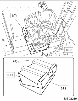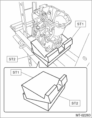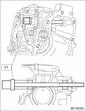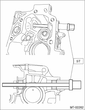 14. Set ST1, ST2 and transfer case to a press. NOTE: • Set the ST2 under ST1. • Set the transfer case so that the hole for shifter arm is positioned vertically.