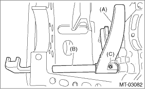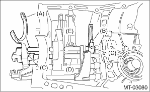10. Use the ST to push out the straight pin of 5th-6th shifter fork and reverse shifter fork, and remove the 5th-6th shifter fork, reverse shifter fork, 5th-6th fork rod and reverse fork rod. NOTE: Tap out the reverse shifter fork straight pin, after setting the gear into reverse position. In the neutral position, removing is impossible because the clearance between transmission case is narrow.