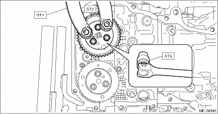 1. CAM SPROCKET RH NOTE: When replacing a single part, perform the work with the engine assembly installed to body. • Intake cam sprocket RH 1. Remove the chain cover. Chain Cover > REMOVAL 2. Remove the timing chain RH. Timing Chain Assembly > REMOVAL 3. Hold the intake cam sprocket RH using the ST1 and ST2, and remove the bolts using the ST3. CAUTION: Perform the operation carefully since the ST comes off easily.