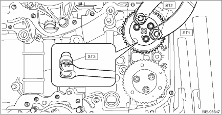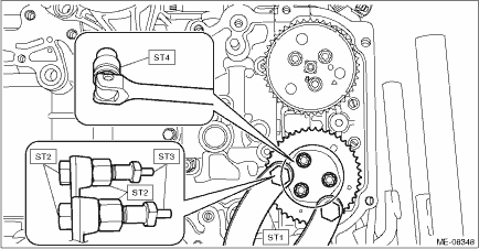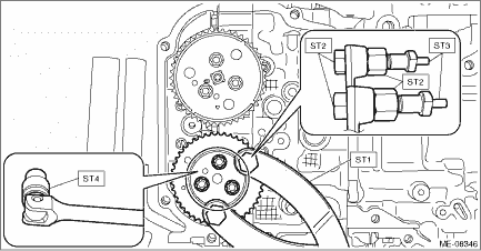 4. Remove the intake cam sprocket LH. • Exhaust cam sprocket LH 1. Remove the chain cover. Chain Cover > REMOVAL 2. Remove the timing chain LH. Timing Chain Assembly > REMOVAL 3. Hold the exhaust cam sprocket LH using the ST1, ST2 and ST3, and remove the bolts using the ST4.
