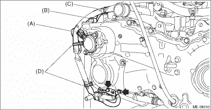 2. Drain the engine oil. Engine Oil > REPLACEMENT 3. Remove the V-belts. V-belt > REMOVAL 4. Remove the generator. Generator > REMOVAL 5. Remove the water pump pulley. Water Pump > REMOVAL 6. Remove the crank pulley. Crank Pulley > REMOVAL 7. Remove the bolt securing the engine harness stay. 8. Disconnect the connector (A) and connector (B) to remove the clip (C) and clip (D) securing the engine harness.