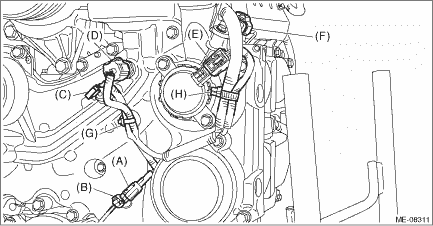 9. Disconnect the connector (A) and remove the clip (B) securing the oil level switch harness. 10. Disconnect the terminal (C), connector (D), connector (E) and connector (F), and remove the clip (G) and clip (H) securing the engine harness.