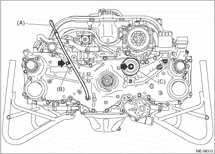 11. Pull out the oil level gauge (A), and remove the oil level gauge guide (B) and idler pulley (C).