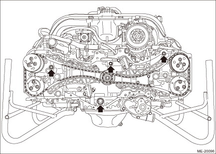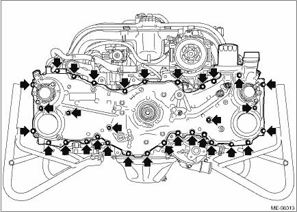 NOTE: When replacing a single part, perform the work with the engine assembly installed to body. 1. When working on the vehicle NOTE: When working on the vehicle, perform the following steps also. (1) Remove the radiator. Radiator > REMOVAL (2) Remove the front exhaust pipe. Front Exhaust Pipe > REMOVAL (3) Remove the engine mounting. Engine Mounting > REMOVAL (4) Remove the bolts which secure the generator cord stay to the chain cover.