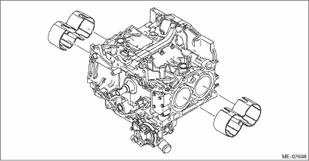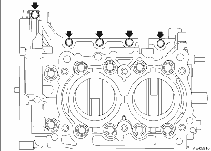 23. Install a bolt of suitable length (M10 - P1.25) at the locations shown in the figure. NOTE: • This procedure is required to prevent the knock pin damage when the cylinder block is raised in the next step. • Use the same length of bolt for the four bolts.