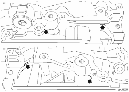 21. Remove the oil pan upper with oil pan from cylinder block. NOTE: Pry the points shown in the figure with a crowbar wrapped by protective tape, and then remove the oil pan upper.