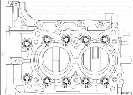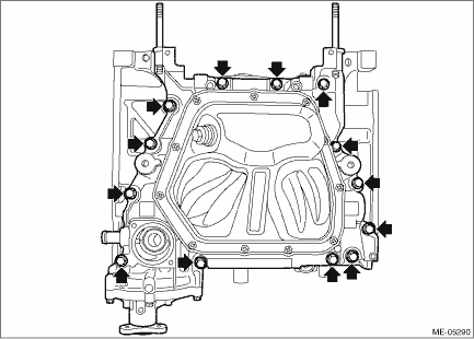 (2) Loosen the cylinder block mounting bolts in numerical order as shown in the figure, and separate the cylinder block RH and LH. NOTE: Lift the cylinder block RH slightly, and confirm that the crankshaft is remaining in the cylinder block LH. If the cylinder block RH is lifted carelessly when separating, the crankshaft may stick to cylinder block RH, then fall off.