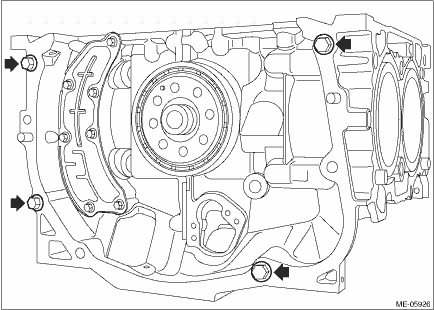 27. Set the cylinder block so that the oil pan side of the block faces upward, and remove the mounting bolts attached to the locations shown in the figure.