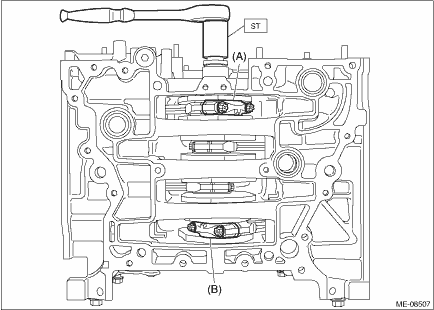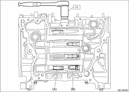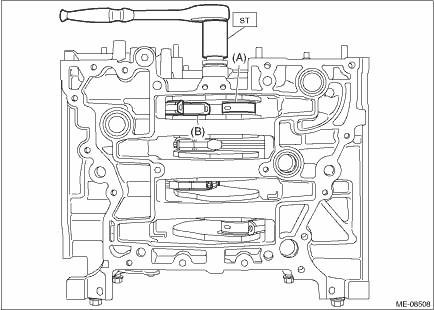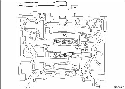 26. Remove the #2 and #3 connecting rod caps and pistons from the cylinder block. NOTE: Mark each connecting rod cap and piston with a cylinder number. (1) Turn the crankshaft so that the #2 connecting rod cap (A) and #3 connecting rod cap (B) is located at the position shown in the figure using ST.