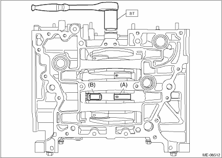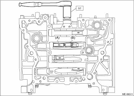 (4) Using the ST, turn the crankshaft clockwise and separate the positions of the #2 pin (A) of crankshaft and the large end (B) of #2 connecting rod.