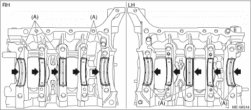 31. Remove the crankshaft bearings from the cylinder block. NOTE: • Be careful not to confuse the crankshaft bearing combination. • Press the bearing at the end opposite to locking lip (A).