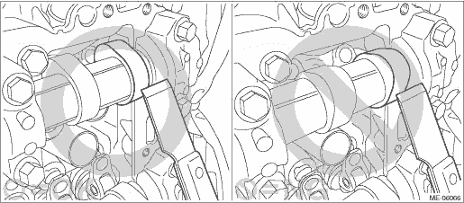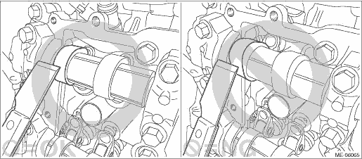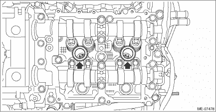 5. Remove the rocker cover gasket LH, #2 spark plug pipe gasket and #4 spark plug pipe gasket, and remove the liquid gasket. CAUTION: • When removing the liquid gasket from engine unit using scraper, use special care not to damage the cam lobe of camshaft LH. • If the cam lobe of camshaft LH interferes, turn the crankshaft to the position where the scraper does not touch.