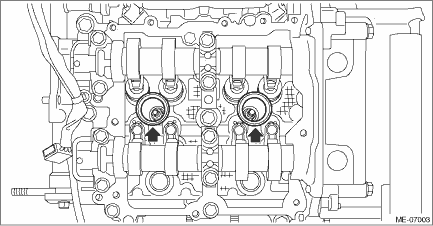 5. Remove the rocker cover gasket RH, #1 spark plug pipe gasket and #3 spark plug pipe gasket, and remove the liquid gasket. CAUTION: • When removing the liquid gasket from engine unit using scraper, use special care not to damage the cam lobe of camshaft RH. • If the cam lobe of camshaft RH interferes, turn the crankshaft to the position where the scraper does not touch.