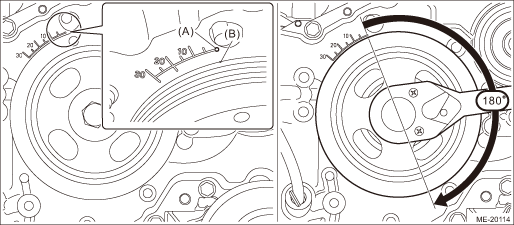 2. ROCKER COVER LH NOTE: When replacing a single part, perform the work with the engine assembly installed to body. 1. When working on the vehicle NOTE: When working on the vehicle, perform the following steps also. (1) Remove the battery. Battery > REMOVAL (2) Remove the V-belts. V-belt > REMOVAL (3) Align the timing mark (B) on crank pulley to the 0° in timing gauge (A) on chain cover as shown in the figure, and turn the crankshaft by 180° clockwise from that position. NOTE: This procedure is required to prevent the rocker cover LH and the cam lobe of camshaft LH contacting with each other when removing the rocker cover LH.