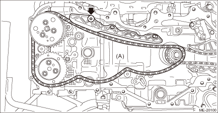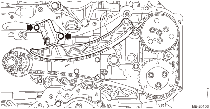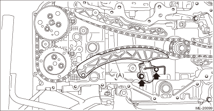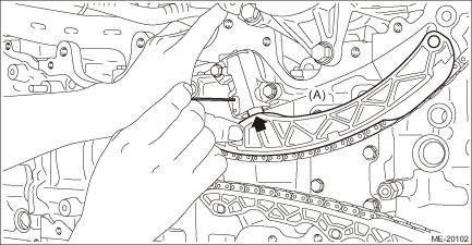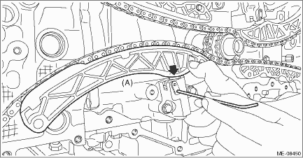 5. Remove the chain guide RH, and remove the timing chain RH (A). CAUTION: • If the timing chain RH is not installed, the intake camshaft RH and exhaust camshaft RH are kept at zero-lift position. All cams on the camshaft are not pressing down the roller rocker arm (intake valve and exhaust valve). (Under this condition, all valves remain unlifted.) • Intake camshaft RH and exhaust camshaft RH can be independently rotated with the timing chain RH removed. When the intake valve and exhaust valve lift at the same time, the valve heads contact each other and valve stem may bend. Do not turn it to the outside of range of zero-lift (in range where it can be turned lightly by hand). NOTE: To avoid mixing with LH side, keep the removed part in order.