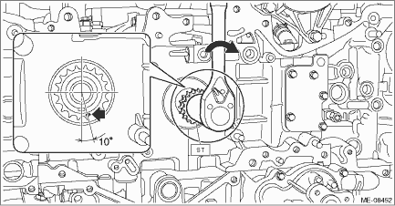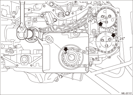 7. Using ST and by turning the crankshaft approximately 200° clockwise, align the alignment marks of crank sprocket to the positions as shown in the figure. CAUTION: • This procedure is required to prevent the valve and piston contacting with each other, by moving the all pistons to the middle of the cylinders. • Never turn counterclockwise because the valve and piston may contact. Counterclockwise turn is allowed only when adjusting precisely the alignment marks, after turning the crank sprocket alignment mark clockwise near the position as shown in the figure.