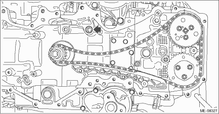1. TIMING CHAIN RH NOTE: When replacing a single part, perform the work with the engine assembly installed to body. 1. Remove the chain cover. Chain Cover > REMOVAL 2. Using ST and by turning the crankshaft, align the alignment marks of crank sprocket, intake cam sprocket RH and exhaust cam sprocket RH to the positions as shown in the figure. NOTE: If the alignment marks are aligned to the positions as shown in the figure, the crankshaft key is located at six o’clock position.
