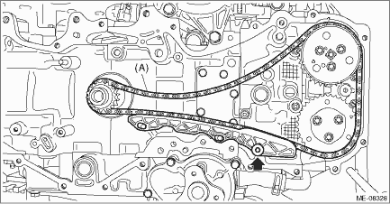 6. Remove the chain guide LH, and remove the timing chain LH (A). CAUTION: • If the timing chain LH is not installed, the exhaust camshaft LH is kept at zero-lift position. All cams on the exhaust camshaft LH are not pressing down the roller rocker arm (exhaust valve). (Under this condition, exhaust valves remain unlifted.) • Intake camshaft LH is kept at lift position. All cams on the intake camshaft LH are pressing down the roller rocker arm (intake valve). (Under this condition, intake valves remain lifted.) • Intake camshaft LH and exhaust camshaft RH can be independently rotated with the timing chain LH removed. When the exhaust camshaft LH is turned, the valve heads contact each other and valve stem may bend as described in above. Do not turn the exhaust camshaft LH to the outside of range of zero-lift (in range where it can be turned lightly by hand). • #1 piston and #4 piston are located near TDC. If the intake camshaft LH is turned, the valve and the piston may contact and valve stem may bend. Do not turn the intake camshaft LH at this time. NOTE: To avoid mixing with RH side, keep the removed part in order.
