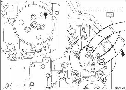 8. Using ST and by turning the intake cam sprocket LH approximately 180° clockwise, align the alignment marks of intake cam sprocket LH to the positions (zero-lift position) as shown in the figure. CAUTION: • After this work, when the intake valve and exhaust valve lift at the same time, the valve heads contact each other and valve stem may bend. Do not turn the intake camshaft LH and exhaust camshaft LH to the outside of range of zero-lift (in range where it can be turned lightly by hand). • Perform the operation carefully since the ST comes off easily.