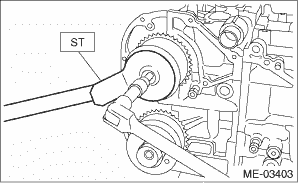 1. Remove the V-belts. V-belt > REMOVAL 2. Remove the crank pulley. Crank Pulley > REMOVAL 3. Remove the chain cover. Chain Cover > REMOVAL 4. Remove the timing chain assembly. Timing Chain Assembly > REMOVAL 5. Use the ST to lock the cam sprocket, and remove the cam sprocket bolt.