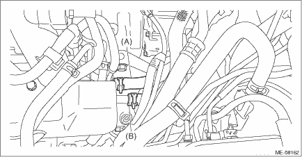 17. Disconnect the heater inlet hose (A) and the heater outlet hose (B).