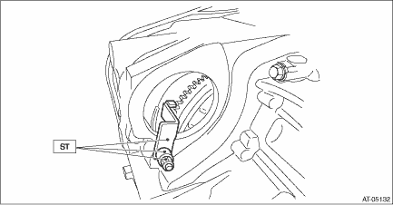 (2) Insert the wrench into the crank pulley bolt, and rotate the crank pulley to remove the four bolts securing the torque converter clutch to the drive plate. (3) Attach the ST to the torque converter clutch case.
