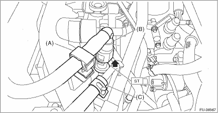 28. Disconnect the fuel delivery tube and evaporation hose. CAUTION: • Be careful not to spill fuel. • Catch the fuel from the tubes using a container or cloth. (1) Remove the clip (A) securing the fuel delivery tube. (2) Attach ST to the fuel pipe assembly and push ST in the direction of arrow mark to disconnect the quick connector of the fuel delivery tube (B).
