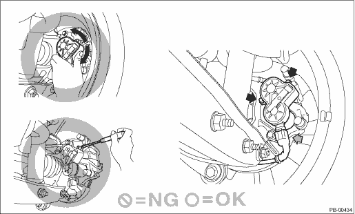 2. PARKING BRAKE ACTUATOR CAUTION: • Do not remove the parking brake actuator assembly except when there are system malfunctions (such as emergency release of parking brake or abnormal actuator) or when the caliper is replaced. When the parking brake actuator assembly is reused, always replace the O-ring with a new part contained in the caliper body assembly. • Do not reuse the parking brake actuator assembly when the emergency release of parking brake was performed or when the actuator has a malfunction. Always replace with a new parking brake actuator assembly. 1. Release the parking brake. 2. Using the Subaru Select Monitor, go to the brake maintenance mode according to the display screen. Parking Brake System > OPERATION NOTE: For detailed operation procedures, refer to “Application help”. 3. Disconnect the ground terminal from battery sensor. NOTE 4. Lift up the vehicle, and then remove the rear wheels. 5. Remove the parking brake actuator assembly. (1) Disconnect the connector. CAUTION: • Be careful that no water and dust enter inside the connectors. • When removing the parking brake actuator assembly, do not use any tools. Slide it upward and downward by hand to remove. (2) Remove the bolts, and remove the parking brake actuator assembly. Preparation tool: Hexagon wrench: 5 mm (0.2 in)