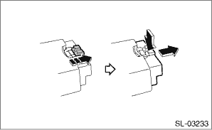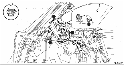 1. Disconnect the ground terminal from the battery sensor, and wait for at least 60 seconds before starting work. NOTE 2. Remove the rod - power rear gate. Power Rear Gate Rod > REMOVAL 3. Remove the trim panel - rear apron LH and trim panel - rear quarter trim UPR rear LH. Rear Quarter Trim > REMOVAL 4. Remove the power rear gate drive unit (PRG D/U). (1) Remove the harness clip, and disconnect the connector. NOTE: Pull the slide lock in the arrowed direction, and disconnect the PRG CM connector by pressing in the lock.