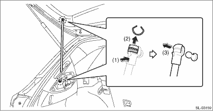 4. Remove the rod - power rear gate. CAUTION: • Using a small flat tip screwdriver wrapped with protective tape, remove the part by gradually applying force. • When the rod - power rear gate is removed, it could lead to abnormal play or noise. Therefore, always replace the stop ring with a new part. Also, be sure to check the clearance of the stop ring before installing. Power Rear Gate Rod > INSTALLATION (1) Press down the rod - power rear gate to the ball stud (bracket rod - power rear gate). (2) With the rod pressed, remove the stop ring while sliding along the ball housing groove. (3) Disconnect the rod - power rear gate from the ball stud (bracket rod - power rear gate).