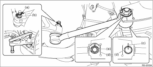 1. Lift up the vehicle, and then remove the rear wheels. 2. Remove the trailing link. Rear Trailing Link > REMOVAL 3. Remove the lateral link assembly - front. (1) Remove the snap pin (a) and nut (b). (2) Remove the ball joint from the housing assembly - rear axle. Preparation tool: Tie-rod ball joint puller (3) Scribe alignment marks (c) on the adjusting bolt for lateral link assembly - front and on the rear sub frame assembly. (4) Remove the adjusting bolt (d), and remove the lateral link assembly - front. CAUTION: • When removing the adjusting bolt (d), make sure to fix the bolt head in place when loosening the nut (e). • Use a suitable tool appropriate to the structure, and be careful not to damage the boot of the joint while removing. The boot may be damaged depending on the tool used.