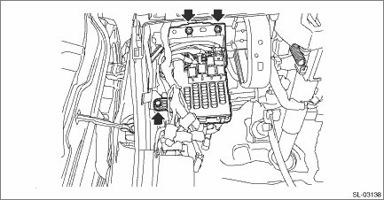 4. Disconnect the body integrated unit (fuse & relay box). (1) Disconnect the connector. (2) Remove the bolts and nuts, and remove the body integrated unit (fuse & relay box).