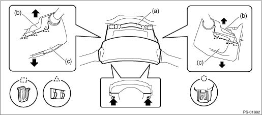 1. MODEL WITHOUT KEYLESS ACCESS WITH PUSH BUTTON START 1. Disconnect the ground terminal from the battery sensor, and wait for at least 60 seconds before starting work. NOTE 2. Remove the cover assembly - column. (1) Remove the clips, and remove the cover - column (a). (2) Remove the screws. (3) Release the claws, and remove the cover assembly - column UPR (b) and the cover assembly - column LWR (c).