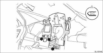 1. Disconnect the ground terminal from battery sensor. NOTE 2. Remove the combination meter assembly. Combination Meter > REMOVAL 3. Remove the keyless access CM. (1) Remove the reinforcement - combination meter. NOTE: For model with navigation and model with telematics, remove the GPS antenna assembly. GPS Antenna > REMOVAL (2) Disconnect the connector and remove the bolt.