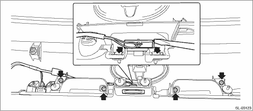 NOTE: • The button - opener rear gate is integrated with the rear lock button. • Open the panel - rear gate before disconnecting the ground terminal from battery sensor. 1. Disconnect the ground terminal from battery sensor. NOTE 2. Remove the trim panel - rear gate. Rear Gate Trim > REMOVAL 3. Remove the garnish assembly - rear gate. Rear Gate Garnish > REMOVAL 4. Remove the button - opener rear gate. (1) Remove the garnish switch bracket from the garnish assembly - rear gate. (2) While pushing the locks at both ends of the button - opener rear gate with a flat tip screwdriver, remove the button - opener rear gate together with the rear lock button.