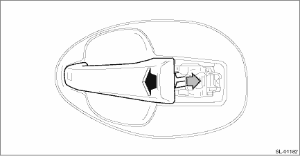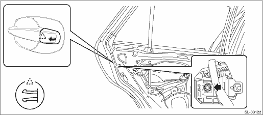 8. Remove the handle - door outer. CAUTION: Do not apply excessive force to remove the handle - door outer from the frame assembly - rear door. (1) Pull the handle - door outer rearward to release engagement of the frame assembly - rear door outer. (2) Pull the handle - door outer towards yourself to remove the handle - door outer.