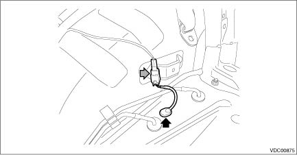 1. Disconnect the ground terminal from battery sensor. NOTE 2. Lift up the vehicle, and then remove the rear wheels. 3. Remove the trunk trim panel assembly - side (sedan model) or rear floor mat (OUTBACK model). • Sedan model: Trunk Room Trim > REMOVAL • OUTBACK model: Remove the rear floor mat and the spacer - rear floor mat. 4. Remove the rear ABS wheel speed sensor. CAUTION: • Be careful not to damage the sensor. • Do not apply excessive force to the sensor harness. • Leave the sensor harness clamp (white arrow) on the vehicle side. (1) Disconnect the connector from the rear ABS wheel speed sensor, and remove the grommet.