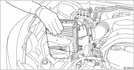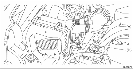 1. Disconnect the ground terminal from battery sensor. NOTE 2. Remove the air intake duct. Air Intake Duct > REMOVAL 3. Disconnect the connector (A) from the mass air flow and intake air temperature sensor, and remove the clip (B) from the air cleaner case (rear).