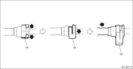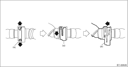 1. Disconnect the ground terminal from battery sensor. NOTE 2. Remove the rear wheel LH. Tire and Wheel > REMOVAL 3. Lift up the vehicle. 4. Remove the rear mud guard LH. Mud Guard > REMOVAL 5. Disconnect the quick connectors of the vent tube (A), canister drain tube (B) and purge tube (C), and remove the tubes from tube clamp (D). NOTE: Disconnect the quick connector as shown in the figure. • Vent tube (A) and canister drain tube (B) (Slider color is red or green.)