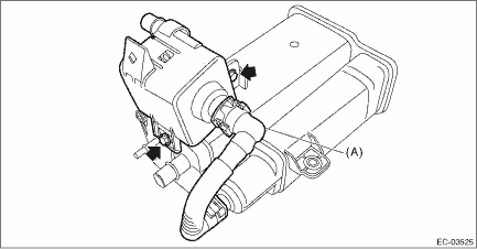 6. Disconnect the connector (A) from the canister and remove the harness clip (B). 7. Remove the canister.