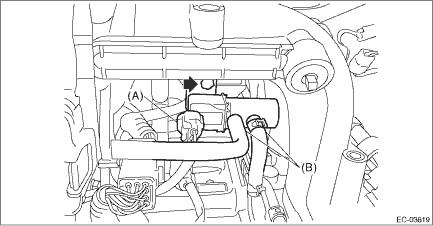 6. Disconnect the connector (A) and vacuum hose (B) from the purge control solenoid valve, and remove the purge control solenoid valve.